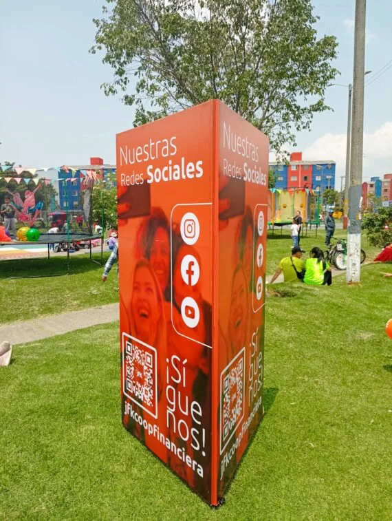 Tríptico tamaño 1.8 mt de alto por 80 cms en tubo cuadrado de pulgada pintada con anticorrosivo negro con banner 13 onz tensado sobre los 3 bastidores.